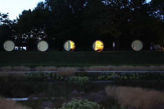 Abends wird die Atomsphäre im Park viel ruhiger, es fahren weniger Züge, man hört das Plätschern des Wassers im östlichen ehemaligen Klärbecken deutlicher. Von den Becken der alten Kläranlage aus gesehen ergeben die Betonröhren eine schöne Licht-Komposition: In den geöffneten Röhren brennt ein warmes Licht, man kann hineinschauen. Die Leute sitzen in den Röhren oder davor: Die Radwanderer beim Rotwein, in der Nähe die vier Studenten, die sich einen Bierkasten mitgebracht hatten. Bald kamen die beiden Grüppchen ins Gespräch und verbrachten den Abend gemeinsam.