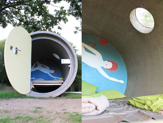 Doppelbett und Bullauge: Blick in eine der Betonröhren