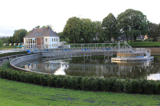Das westlich gelegene Klärbecken, links dahinter die Betonröhren, rechts das Maschinenhaus (Restaurant)