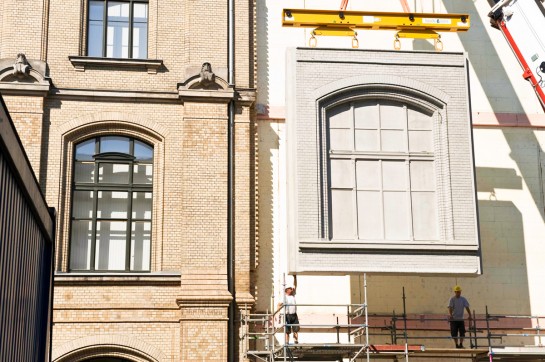 Anstatt die nicht mehr vorhandenen Teile der historischen Ziegelfassade im gleichen Material „nachzubauen“, entschieden sich die Basler Architekten für eine ungewöhnliche Variante der Denkmalpflege, um „Alt“ und „Neu“ in irritierender Weise sichtbar zu machen und miteinander zu verbinden: Von den erhaltenen Teilen der Ziegelfassade wurden Abdrücke aus gummiähnlichem Material hergestellt, sogenannte „Strukturmatrizen“. Mit diesen Vorlagen konnten von einem spezialisierten Betonfertigteil-Hersteller exakte Fassadenelemente gegossen werden. Auf der Baustelle wurden die Teile zur neuen Fassade zusammengesetzt.