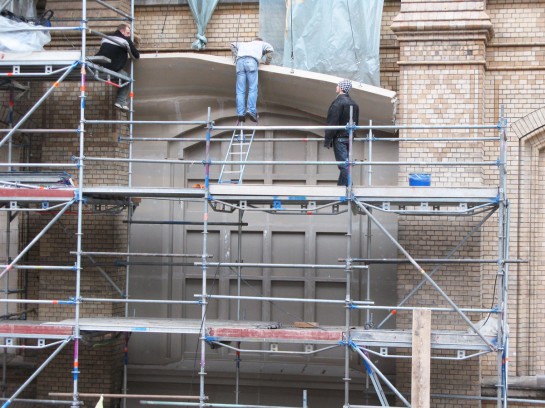 Eine Strukturmatrize wird von der Altbaufassade abgelöst (Foto: Carola Radke)