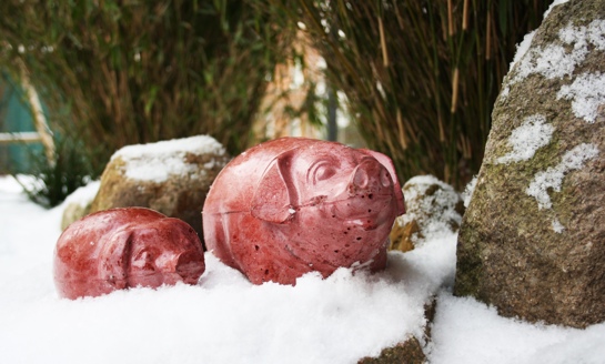 Die Schweine aus rotgefärbten Beton sind im Rahmen einer Studienarbeit entstanden.