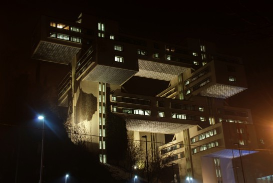 Mit dem Satz „Feel the Future“ wirbt die Bank of Georgia um Kunden. Aus Architekten-Sicht kommt das Verwaltungsgebäude in Tiflis diesem Versprechen schon sehr nah: Fünf horizontale, zweigeschossige Gebäuderiegel stehen wie aufeinander gestapelt am Stadtrand, die Landschaft „fließt“ hindurch. In dem futuristischen Bau arbeiteten ab 1975 Beamte des sowjetischen Straßenbau-Ministeriums. Nach der Übernahme durch die georgische Bank wurden die knapp 11.000 Quadratmeter nach den Entwürfen von AG&P (Tiflis) komplett saniert und im Inneren mit Lichtbeton-Elementen ausgestattet. In den Geschäftsräumen strahlen seit 2011 die hinterleuchteten Wandverkleidungen – aus Beton!