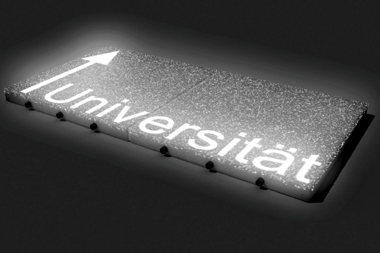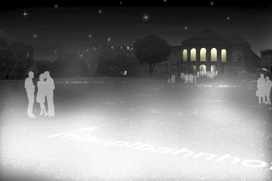 Um den weiten Platz zu strukturieren, plant David Vogel an verschiedenen Stellen die Verwendung von Betonplatten mit „Blingcrete“-Oberfläche. Sie reflektieren das Sonnenlicht: Schwach glimmend am Tag, deutlich leuchtend in der Nacht. Nach Sonnenuntergang soll der Platz ausserdem zu einer riesigen, horizontalen Informationstafel werden: Durch „Blingcrete“-Elemente mit Leuchttext werden Richtungshinweise auf der Platzoberfläche angezeigt. Das klingt utopisch, sieht auf den CAD-Renderings aber schon sehr gut aus.