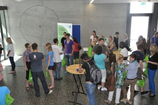 Der Eingangsbereich bei einer Veranstaltung, dahinter die Betonscheibe