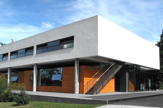 Im Wohn- und Gewerbebau sind mit hochfestem Beton neue konstruktive und gestalterische Lösungen möglich. Beispiel unten: Beim Musikgymnasium in Weimar tragen schlanke Stützen aus Hochleistungsbeton die Lasten aus dem Obergeschoss. Das Erdgeschoss ist nur „eingeschoben“ und trägt nicht.