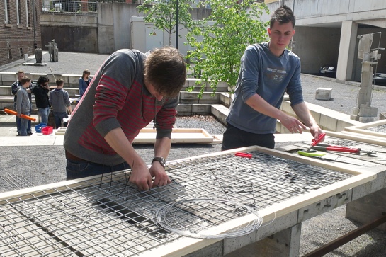 In Werk eines Beton-Fertigteil-Unternehmens in Beverungen wurden die Platten von den Studenten-Teams hergestellt. Dazu montierte man die in der Hochschule vorbereiteten Schalungsrahmen auf einem Stahl-Rütteltisch, um die flachen Betonplatten gleichmäßig zu verdichten. Anschliessend wurde Frischbeton in die Schalungen eingebracht und in den Schalungen verteilt. Nach dem Transport der fertigen Platten zurück zur Hochschule wurden die Tische montiert, getestet und schliesslich stolz auf den Campus präsentiert.