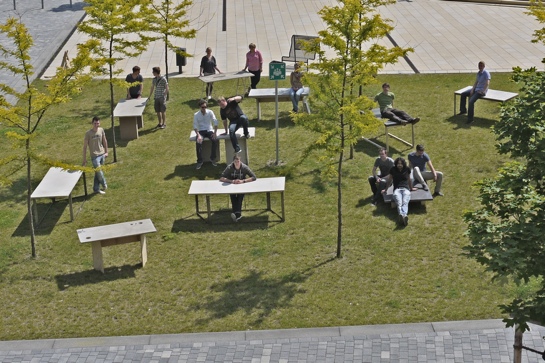 Gruppenbild auf dem Campus: Die fertigen Beton-Tische