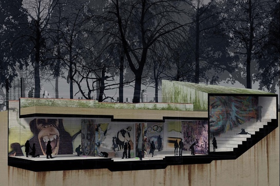 Wer Hogwarts liest, denkt an einen Bestseller und Kinohit aus England. „Ja, in sehr weitem Sinn hat unser Projekt auch etwas mit Harry Potter zu tun: Wer den Ort findet, ist würdig, dort zu sein …“ sagt Alexander Kempf über den Projektnamen „Streetart Hogwarts“, den er sich zusammen mit Gerry Schreiber ausgedacht hat. Denn wie die Zauber-Schule in Harry Potter ist die Galerie, die die beiden Architekturstudenten im Osten London planen, eigentlich unsichtbar. Zumindest fast: Sie liegt, gut versteckt hinter alten und neu gepflanzten Bäumen, auf einem schwer zugänglichen Restgrundstück zwischen Bahngleisen und der Brick Lane, einer angesagten Straße im Stadtteil Shoreditch. Auch die Platzierung des Baukörpers – halb oberirdisch, halb unterirdisch – basiert auf der Idee des „unsichtbaren“ Atelierhauses, denn man „soll es eben nicht gleich finden“ so Alexander. Das Haus ist dem (anonym agierenden) britischen Streetart-Künstler Banksy gewidmet. „Die Form und die Erschliessung des Gebäudes folgt dem Prinzip der Fluchtmöglichkeiten: Weil Streetart-Künstler oft illegal agieren, sind Fluchtmöglichkeiten in alle Richtungen wichtig … Wir haben dazu die Eckpunkte des Grundstücks verbunden und so die Erschliessung des Gebäudes entwickelt.“
