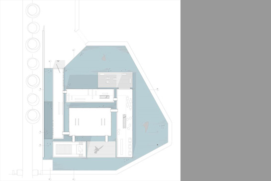 ankommen. Eine Wand aus glattem Sichtbeton begleitet den Weg bis hin zum Eingang des Kunsthauses. Dies sorgt für eine konzentrierte Bewegung und lässt einen erkennbaren, für sich stehenden Raum entstehen. Das Element Wasser umgibt die einzelnen Baukörper, somit wird die Fügung der Räume sichtbar und es entsteht eine Spannung und Dynamik der einzelnen Körper.