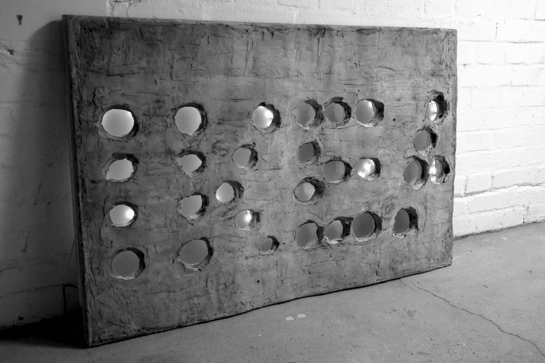 Valentina Kran und Katharina Görtz haben zunächst kleine Kunststoffbälle aufgeschnitten und mit Wachs gefüllt. Die so entstandenen Halbkugeln haben sie auf eine Siebdruckplatte geklebt, die als Grundlage für ihre Schalungsform diente. Ziemlich schwierig war allerdings das anschließende Ausschalen mit einem Heißföhn.