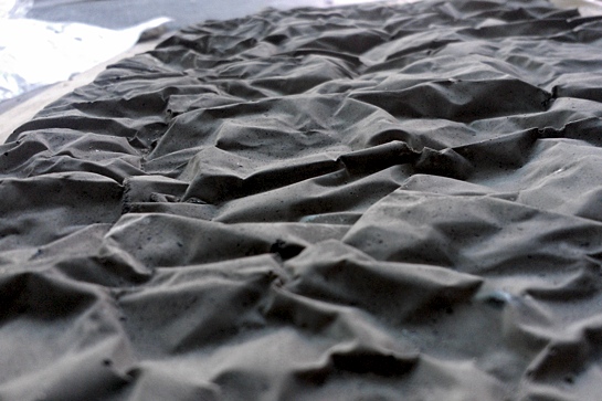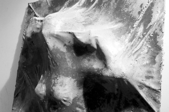 Eine ziemlich ambitionierte Idee entwickelten Carina Kisker und Max Ernst: Ihr Fassadenelement sollte eine Person abbilden, die versucht, sich aus dem Beton zu befreien. Der erste Versuch, eine Latexschicht auf eine Puppe zu legen und ein Vakuum zu ziehen, gelang zwar, brachte aber nicht die gewünschte Faltengebung und das textilartige Aussehen. Nach weiteren Versuchen wurden zunächst Abdrücke von Armen, Kopf und Oberkörper aus Beton vorgefertigt. Anschließend wurde unter einer PVC-Folie ein Vakuum gezogen. Da die PVC-Folie deutlich fester ist als Latex, bildeten sich „schönere“ Falten. Der Gipsabdruck von der verformten PVC-Folie diente dann als Schalung.