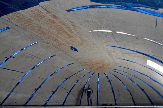 Wenn die Betonplatte ausgehärtet ist, wird das darunter liegende Luftpolster vorsichtig aufgeblasen. Der Beton krümmt sich, und in kurzer Zeit entsteht eine belastbare, stabile Schale. Im Video lässt sich dieser Prozess sehr schön im Zeitraffer beobachten.