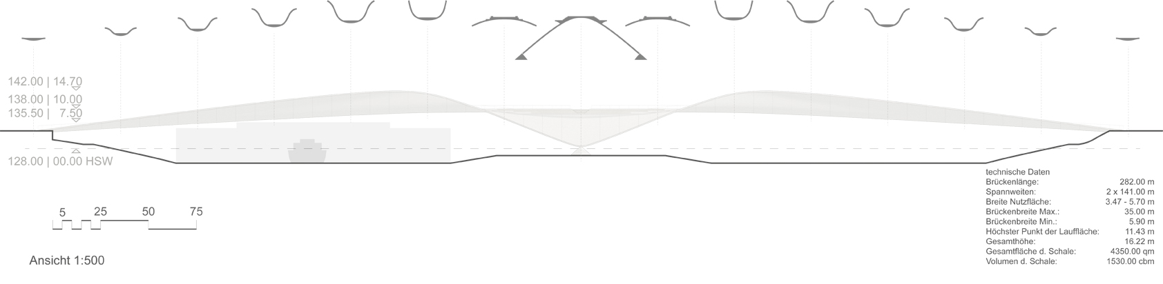 Über seine gestalterischen Qualitäten hinaus überzeugt der Entwurf durch die Thematisierung und Durchdringung technischer Fragen bis hin zur Fertigung und Montage. Vorgeschlagen wird eine Segmentbauweise, bei der jeweils 5 m breite, vorgefertigte Elemente vor Ort über Vorspannung gefügt und montiert werden. Dieser Lösungsvorschlag könnte unter Nutzung digital gesteuerter Fertigungsprozesse sinnvoll und zukunftweisend sein.