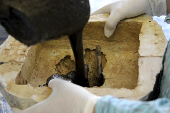 Die beiden zusammengefügten Halbschalen aus Gips werden mit Beton ausgegossen.