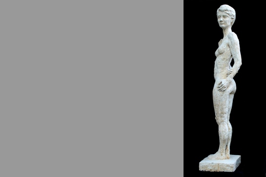 Um das fertige Tonmodell herum wird zunächst eine Trennschicht aus abstehenden Tonstreifen angefügt. Sie teilt das Modell – hier eine stehende Aktfigur – in zwei senkrechte Hälften und trennt die späteren Halbschalen für den Guss. Von beiden Seiten wird anschließend Gips auf das Tonmodell aufgetragen. So entsteht auf jeder Seite der umlaufenden „Ton-Trennwand“ eine Gipsnegativform. Bei größeren Skulpturen muss der Gips durch eine geeignete Armierung verstärkt werden.