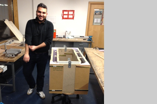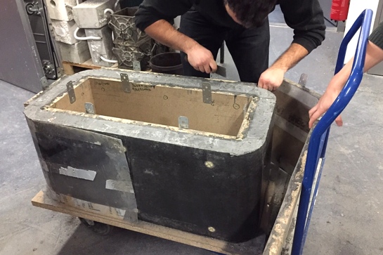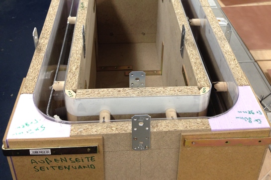 Um den offenen Betonquader mit seinen runden Ecken zu gießen, stellte der 28-Jährige eine individuelle Schalung her: Die ebenen Flächen werden von herkömmlichen Pressspanplatten begrenzt. Für die abgerundeten Ecken hat der Master-Student Styrodurblöcke erst grob zugeschnitten, dann auf die benötigte Rundung von Hand geschliffen. Die Innenflächen der Schalung hat er schließlich mit einer 2mm starken PVC-Folie beklebt, um eine homogene und glatte Oberfläche herzustellen.