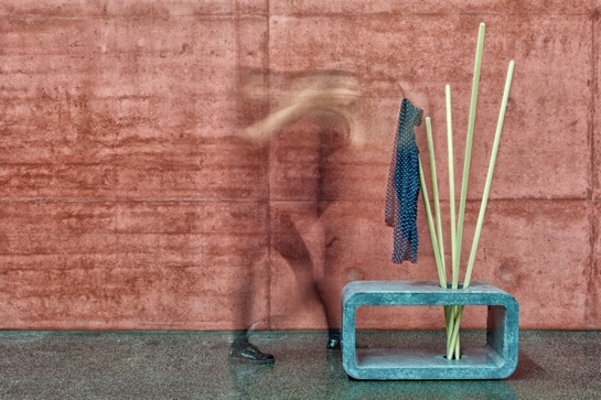 Das Entwurfsprinzip ist denkbar einfach und kommt mit nur zwei Baumaterialien aus: Beton und Holz. Der Betonquader (90 x 45 x 40 cm) dient als Ablagefläche für Taschen oder Schuhe und ist gleichzeitig Sitzbank, z. B. zum Schuheanziehen. In eine kreisrunde Öffnung des Quaders werden Rundhölzer gestellt, an deren obere Enden Jacken und Mäntel gehängt werden.