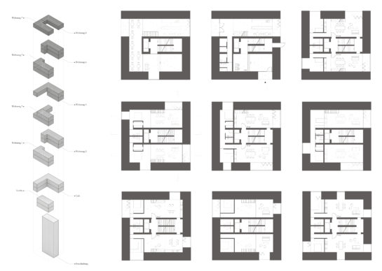 Der Entwurf gestaltet die Umnutzung eines siebengeschossigen Hochbunkers aus dem 2. Weltkrieg in der Hammer Südstadt. Durch verschieden große Öffnungen, die allseitig in die ca. zwei Meter dicke Betonhülle geschnitten werden, entsteht Raum für acht Wohnungen sowie ein Café in den beiden unteren Ebenen des Gebäudes. Die unterschiedlich großen Wohnungen sind größtenteils als Maisonetten konzipiert und bieten mit räumlich spannenden, stimmig auf die neuen Öffnungen abgestimmten Grundrissen jeweils Ausblicke in mindestens zwei Himmelsrichtungen. Dabei wird die räumliche Tiefe der Außenwand durch die unterschiedlich hohe Positionierung der Öffnungen mal als großzügige Loggia, mal als Fenster mit vorgelagerter Sitzstufe ausgebildet.