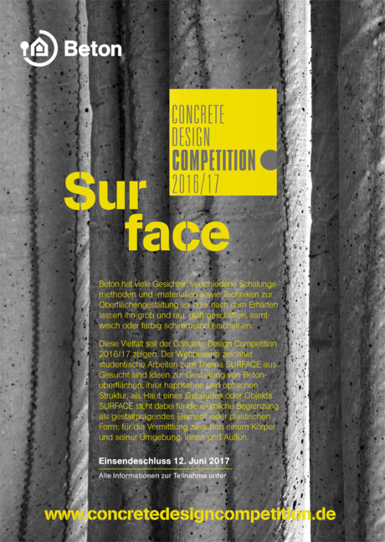 Es ist wieder soweit – der Concrete Design Competition geht in eine neue Runde und wird nun schon zum 10. Mal ausgelobt. Der Wettbewerb für das Studienjahr 2016/17 steht unter dem Thema SURFACE. Gesucht werden Ideen zur Gestaltung von Betonoberflächen, ihrer haptischen und optischen Struktur, als Haut eines Gebäudes oder Objekts. SURFACE steht dabei für die räumliche Begrenzung als gestaltprägendes Element jeder plastischen Form; für die Vermittlung zwischen einem Körper und seiner Umgebung, Innen und Außen.