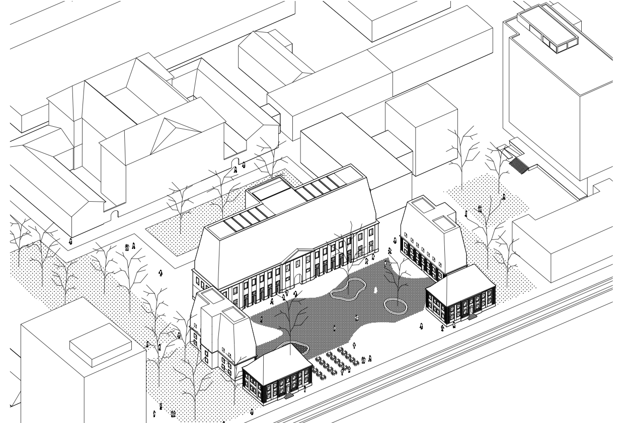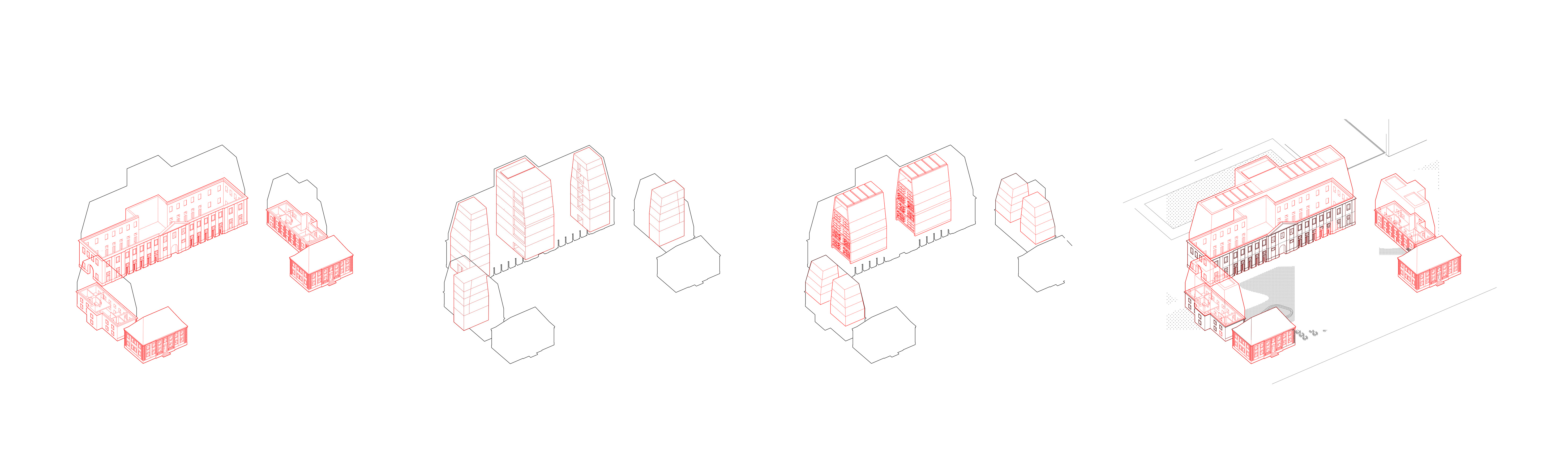 So interpretiert der Entwurf die städtebauliche Situation zwischen modernen Campus-Hochhäusern und angrenzenden Quartieren aus der Entstehungszeit der Stadt auf eine zugleich radikale und sensible Weise, bei der das Neue trotz seines großen Volumens den Bestand überraschenderweise nicht dominiert, sondern in seiner Präsenz stützt. Die Betoneinbauten fügen sich konstruktiv eigenständig mit stützenden Kernen für die dienenden und vertikalen Funktionen sowie zwischen den Kernen spannenden Archiv-Boxen in die – je nach Erhaltungszustand – mehr oder weniger stark entkernten Bestandsgebäude ein und formen oberhalb der historischen Fassaden steile, flach abschließende Dächer ohne Öffnungen. So entsteht Raum für drei bis vier zusätzliche Ebenen, die über Oberlichter belichtet werden oder unbelichtete Lager beinhalten. Diese Thematisierung und radikal geschlossene Umsetzung der Dächer betont die monolithische Qualität des Betons und verwischt auf faszinierende Weise die Dimensionen der Neubauten.