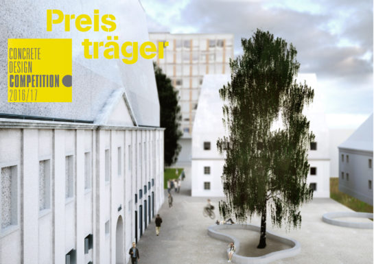 Darüber hinaus würdigt die Jury insbesondere den Dialog der Materialien, mit dem der Entwurf ein Spannungsfeld zwischen Bestand und Neuem aufbaut: Die historischen Außenwände mit ihren weißen Putzoberflächen bleiben rundum erhalten; dort, wo die neue Nutzung ohne Außenbezug und die Fassaden nicht mehr korrespondieren, entstehen durch die eingestellten Betonkörper blinde Fenster. Während im Innern eher niedrige Anforderungen an die Oberflächenqualitäten des Sichtbetons den funktionalen Charakter der neuen Bauteile unterstreichen sollen, wird die nach außen sichtbare Hülle aus Stahlbeton mit hochweißem Farbzuschlag ausgeführt, geschliffen und hochglänzend poliert. So erscheinen die neuen Baukörper hinter den stumpf weißen historischen Fassaden geheimnisvoll schimmernd und edel, in der leichten Neigung der Dächer spiegelt sich der Himmel und lässt die massigen Volumen leicht, fast transparent erscheinen. In dieser ungewöhnlichen Materialanmutung des Betons, der sonst meist tragend, roh und schwer wirkt, liegt für die Jury die große Überraschung und Faszination des Entwurfs.