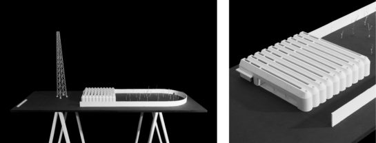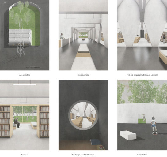 Der für die Bibliothek gewählte Standort ist ungewöhnlich: Die Verfasser platzieren das Gebäude zentral auf einem großen, wild bewachsenen Grundstück in einem unwirtlichen Industriegebiet in Berlin-Lichtenberg, auf dem sich bislang nur ein einsam in die Höhe ragender Funkmast befindet. Die Stahlkonstruktion wird im Sinne eines Artefakts auf dem Vorplatz der Bibliothek erhalten und als identitätsstiftendes Element in den Entwurf einbezogen. Dessen konzeptioneller Kern ist die Thematisierung räumlicher Übergänge und Grenzen als besondere Momente des Gleichgewichts zwischen zwei Spannungsfeldern. So soll das Bibliotheksgebäude vermitteln zwischen dem öffentlichen Grundstück und einem geschützten Garten, der hufeisenförmig von einer hohen Mauer gefasst wird. Es ist im Sinne einer prägenden räumlichen Identität schlicht und raffiniert zugleich gestaltet.