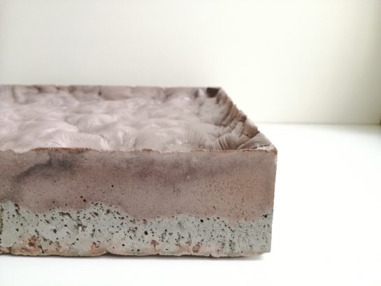 Ein schönes Beispiel liefert die Fliese, deren Oberfläche wie Wasser anmutet: „Um ein Tiefenrelief mit keramikartiger Oberfläche zu erreichen, das wie ein Kissen wirkt haben wir in unserer Schalung grobe Kieselsteine mit einer Frischhaltefolie überspannt. Anschließend gossen wir eine Oberflächenschicht aus feinem Mörtel mit joghurt-artiger Konsistenz und darauf eine trockene Tragschicht aus Beton. Die Oberfläche wirkt glatt und glänzend, als wäre die Frischhaltefolie noch auf dem Beton. Durch den Lichteinfall sieht es aus wie eine Wasseroberfläche.“