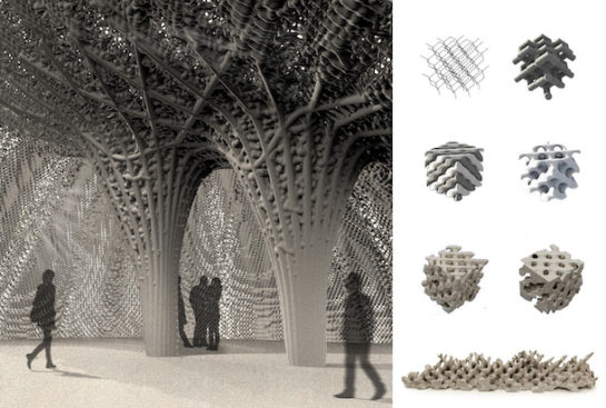 Gabriel Rihaczek von der Universität Stuttgart greift das dort entwickelte 3D-Druck-Verfahren „Hydroplotting“ auf, das mit Hilfe von Sandschalungen komplex geformte, poröse Betonstrukturen generiert. Aus der besonderen Ästhetik dieser technischen Entwicklung heraus formuliert er eine architektonische Vision als mögliche zukünftige Einsatzform. Dabei bildet das vermeintlich schwere, massive Material Beton eine gewebeartige Struktur mit variierender Dichte und Transparenz. © BetonBild
