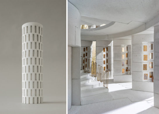 Marc Mair und Matthias Peterseim von der TU München ergänzen den Friedhof Haidhausen in München mit einem Kolumbarium. Zur Gestaltung des runden, 36 Meter hohen Turms setzen sie Betonfertigteile im Sinne von stapelbaren „Kunststeinen“ ein und thematisieren sehr gelungen die Frage der Fügung. © BetonBild