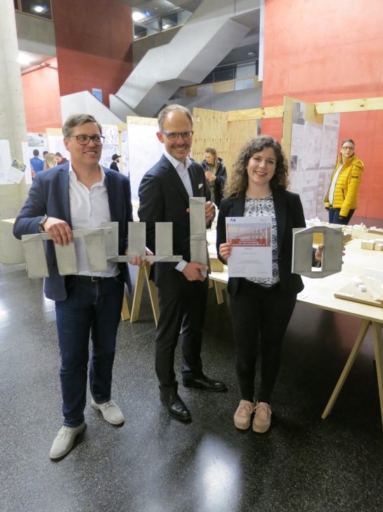 FDB-Förderpreis-Gewinnerin Anouschka Pohlenz mit Professor Dominik Wirtgen (links) und dem technischen Geschäftsführer der FDB e.V., Mathias Tillmann (Mitte), mit Muster-Elementen aus ihrer preisgekrönten Arbeit. Foto: FRA-UAS, FB 1