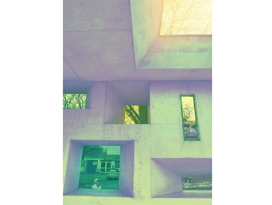 Selbst am kürzesten Tag des Jahres fällt das Licht wunderbar durch die Öffnungen in der 50 cm starken Betonwand. Sie dient nicht nur als Lärmschutz zur Durchfahrtsstraße, sondern auch als Filter zur Stadt, der Aus- und Einblicke ermöglicht. Aus weißem Beton und buntem Glas entsteht ein sakrales Farbenspiel à la Ronchamp.