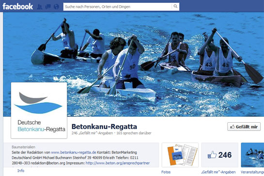Den Beweis, dass Beton schwimmen kann, werden im nächsten Jahr wieder die Teilnehmerinnen und Teilnehmer der Betonkanu-Regatta antreten. Bereits zum 14. Mal findet dann, am 21. und 22. Juni 2013, die Betonkanu-Regatta der deutschen Zement- und Betonindustrie statt – diesmal auf dem Dutzendteich in Nürnberg. Rund 1.000 Azubis und Studierende in ihren Betonkanus und Wasserfahrzeugen der Offenen Klasse („Ist aus Beton und schwimmt.“) werden wieder erwartet. Seit zwei Wochen gibt es jetzt auch eine neue Facebook-Seite zur Betonkanu-Regatta. Dort wird es im Vorfeld und Nachgang Fotos und Berichte zur Regatta geben. Fast 250 Fans sagten in den ersten beiden Wochen bereits „Gefällt mir.“