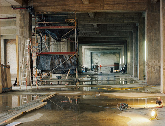 Berlin-Oberschöneweide. Früher wurden hier Kabel produziert, heute wird hier gelesen und studiert. Seit 2009 beherbergt die gewaltige Betonhalle aus den 50-er Jahren die Bibliothek der Hochschule für Technik und Wirtschaft. Neues Leben im alten Beton! Das Foto habe ich in der Umbauphase gemacht. Der Raum wirkt hier malerisch und atmosphärisch, anders als man sich den Alltag auf der Baustelle vorstellt.
